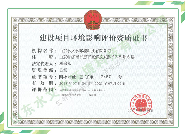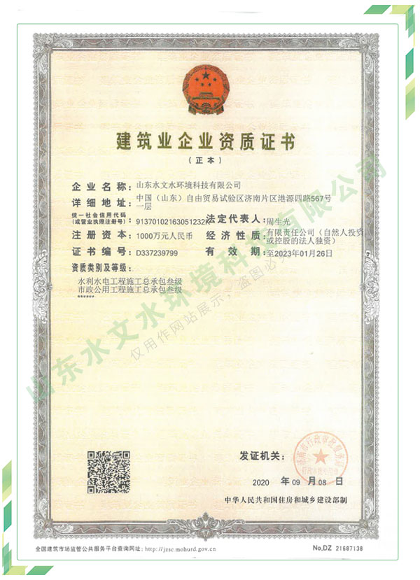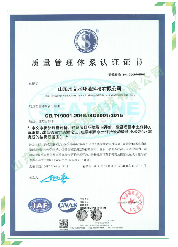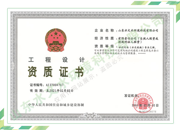 公司擁有水利工程設(shè)計(jì)、水土保持、水文水資源調(diào)查評(píng)價(jià)、水資源論證、建設(shè)項(xiàng)目環(huán)境影響評(píng)價(jià)、市政公用工程施工總承包、水利水電工程施工總承包、電子與智能化工程專業(yè)承包等資質(zhì),2017年通過質(zhì)量管理體系、環(huán)境管理體系、職業(yè)健康安全管理體系認(rèn)證;2020年被評(píng)為國家級(jí)高新技術(shù)企業(yè),同年被中國水利企業(yè)協(xié)會(huì)推薦為第一批“合同節(jié)水服務(wù)企業(yè)”;2021年被山東省、濟(jì)南市評(píng)為 “專精特新”中小企業(yè)。業(yè)務(wù)范圍涉及水利工程設(shè)計(jì);節(jié)水設(shè)計(jì)、改造、水平衡測(cè)試;山洪災(zāi)害調(diào)查;城市水資源調(diào)查評(píng)價(jià);建設(shè)項(xiàng)目水土保持方案編制、監(jiān)測(cè)、驗(yàn)收、水土保持規(guī)劃;水安全保障規(guī)劃、建設(shè)項(xiàng)目水資源論證、規(guī)劃水資源論證;建設(shè)項(xiàng)目環(huán)境影響評(píng)價(jià);入河排污口論證;防洪影響評(píng)價(jià);市政公用工程施工、水利水電工程施工、電子與智能化工程施工等。